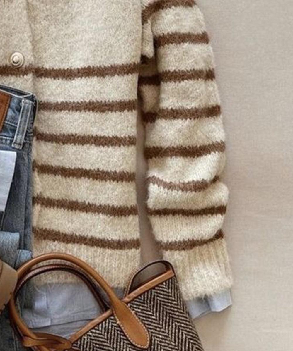 This MILEY™ | Apricot Long Sleeve Striped Cardigan is a versatile addition to any wardrobe. Perfect for cooler days, it features a timeless striped design and long sleeves for added warmth. Made from high-quality materials, it's both comfortable and stylish, making it the perfect option for everyday wear. With its classic design and practical features, this cardigan is a must-have for any fashion-forward individual.