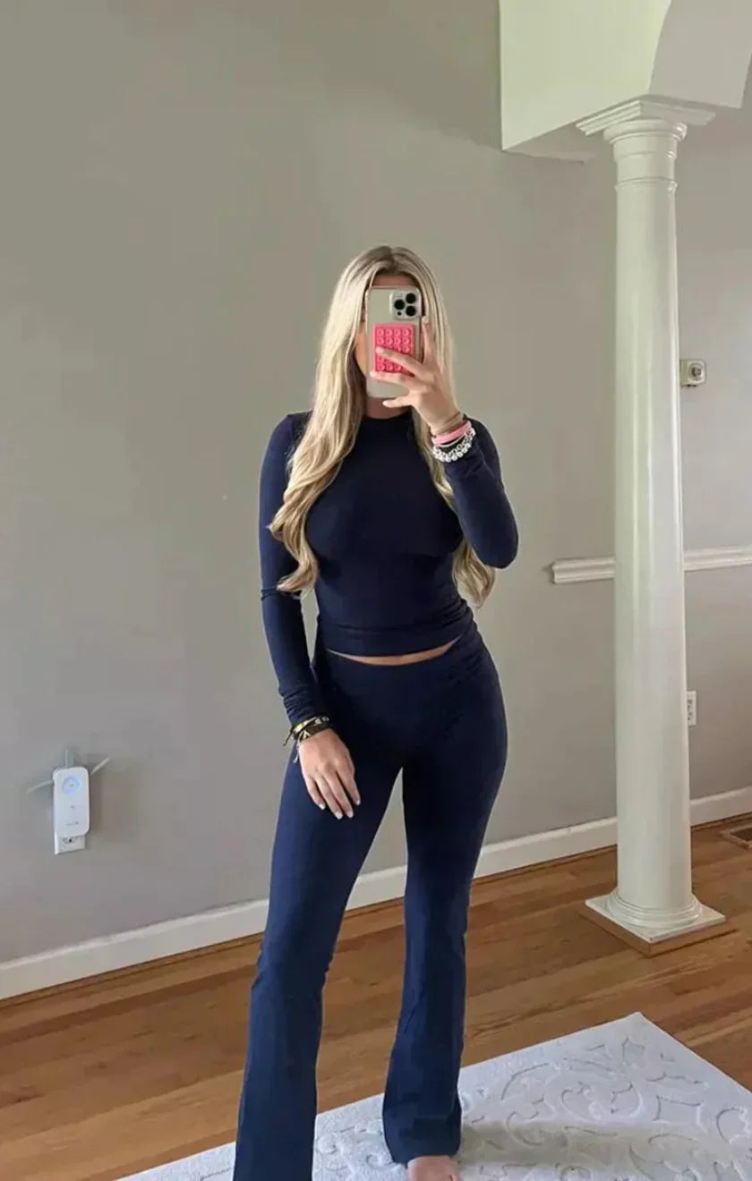 Stay snug and stylish with our essential lounge set for the cooler months! A soft, fitted tee meets stretchy yoga pants, keeping you cozy and chic all day. Your go-to for warmth and comfort with a touch of fashion flair!
