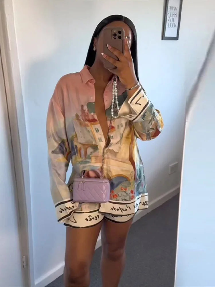 Fashion Floral Women's Two Piece Suit Turn-down Collar Long Sleeve Single Breasted Top Short Pants 2025 Summer Lady Causal Set