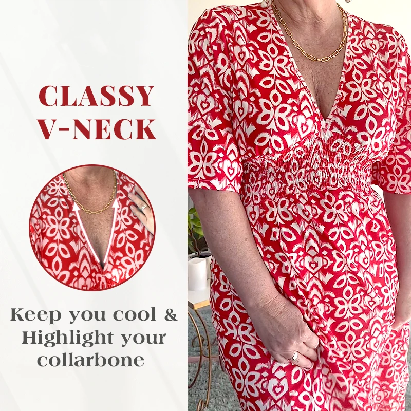 Designed with a V-neckline and a relaxed bust, this dress offers a comfortable and flattering fit. The lightweight fabric adds to its airy feel, making it your go-to choice for breezy days and nights.